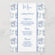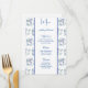 This wedding menu card is shown on basic paper in a lovely blue floral print. Script and standard text in a blue tone colour.