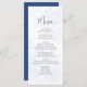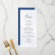 This design features a wedding menu card, with an elegant calligraphy script, with classic blue floral design, with a simple meal course, and ampersand monogram on the back.