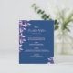An elegant and trendy floral wedding menu card. Personalise and add your names, date and the wedding menu. Blue background decorated with pink botanical sprigs and foliage. Your names are written with a modern hand lettered style script.