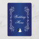 Wedding dinner menu bride and groom design royal blue coloured. You can customise this royal blue coloured wedding dinner menu with your wedding details. Should you require any help with customising then contact us through the link on this page. Bride and groom design royal blue coloured personalised wedding dinner menu
