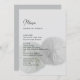Modern, sand dollars wedding menu template. Neutral grey tones and black text. Text aligns to the left side with "Menu" title and names of the bride and groom. All menu selections are added in a paragraph. Two big, white sand dollar images are the background. Reverse is a darker grey colour.