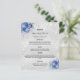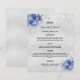 An elegant, glamourous wedding menu. Personalise and add your names, date and the wedding menu. Faux silver looking background, decorated with faux glitter dust and blue flowers.
