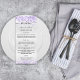 An elegant, glamorous wedding menu card. Personalize and add your names, date and the wedding menu. Faux silver metallic looking background, decorated with purple, violet faux glitter,sparkles