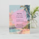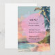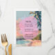 This menu card design showcases an artistic tropical beach scene, featuring silhouetted palm trees set against a vibrant, pastel-toned sunset sky. A soft-edged, organic pink shape overlays the centre of the design, providing a modern backdrop for the menu text. The overall aesthetic is elegant and breezy, perfectly suited for a beachside or summer-themed wedding reception, with the soothing colours and coastal imagery creating a tranquil atmosphere for guests.