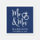 Custom navy blue napkins for your wedding reception and wedding events with "Mr & Mrs" written in a large white script and a white illustration of two wedding rings joined together. Add your last name and wedding date.