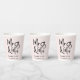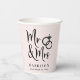 Chic light pink paper cups for your wedding reception and events with "Mr & Mrs" written in a large elegant script and an illustration of two wedding rings joined together. Personalise with your last name and wedding date.