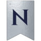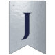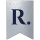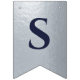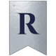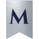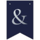 A bunting flags banner for a wedding with navy and silver wedding colours, with the words "Mr. & Mrs." and the family name of the new couple and 3 hearts. The text is in navy blue caps on faux silver foil background,  the hearts and the ampersand are faux silver foil on navy blue background.
