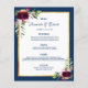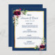 An elegant bohemian boho style wedding menu card. Feathers and lush watercolored roses in burgundy. Templates for your names, date and the wedding menu. A faux gold frame and a chic navy blue and white background. Navy blue coloured letters.