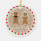 An ornament to celebrate your first Christmas as husband and wife. Ornament features an illustration of a gingerbread bride and groom. Light brown background with red & green candy circle surrounding design. Personalise the white text under bride and groom with your names and wedding date.