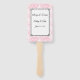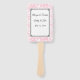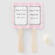 This wedding paddle fan is shown in a light pink floral background print with sample names and date, customise and change the text to yours.