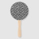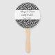 This wedding paddle fan is shown with a elegant black and white damask print and sample names and date.
