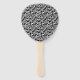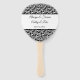 This wedding paddle fan is shown with a elegant black and white damask print and sample names and date.