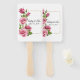 This wedding paddle fan is shown with a pretty pink roses print and sample names and date.
