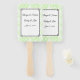 This wedding paddle fan is shown in a mint green floral background print with sample names and date, customise and change the text to yours.