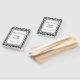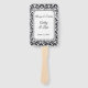 This wedding paddle fan is shown with a elegant black and white damask print and sample names and date.