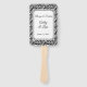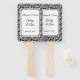 This wedding paddle fan is shown with a elegant black and white damask print and sample names and date.