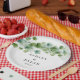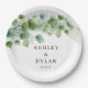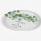 This wedding paper plate is shown with a eucalyptus vine leaves art print.