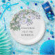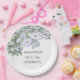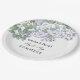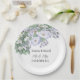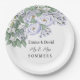 Wedding paper plates is shown in a lovely lavender blue floral print with custom sample names shown in a text in a black colour.