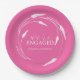 These wedding paper plates feature the words "We're engaged" in script typography encircled by a wreath of floral line art in white over a vibrant fuchsia pink background. A modern yet simple choice for your engagement party. To see more designs like this visit www.zazzle.com/dotellabelle