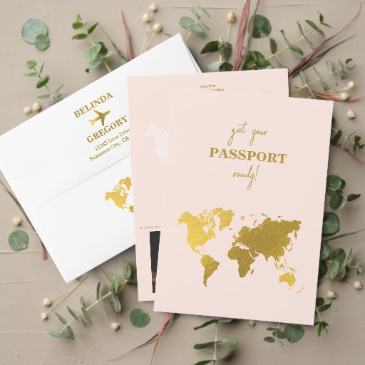 A blush pink and gold destination wedding passport design with gold world map, airplane and travel elements. This design is ideal for all Spring, Summer, Fall and Winter destination weddings. An elegant blush pink and gold wedding travel design with passport layout, world map and custom couple photo. A modern destination wedding Itinerary program design with elegant elements. Matching wedding invitations and other stationery items are also available.