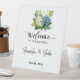 This pedestal sign is shown in a wedding format, shown with a lovely hydrangea's art print.