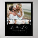 Wedding photo collage poster with personalised text and zigzag picture strip. The template is set up ready for you to add five photos - the main photo will be used as the background and the remaining 4 photos will be laid out in a zigzag picture strip along the bottom. This design has a black background, fine black photo frames and elegant white typography, which is fully editable.
