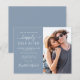 Budget-friendly dusty blue wedding save the date announcement featuring your photo and "Happily Ever After" in a mix of simple modern white typography and a stylish white script with swashes. Personalise your save the date details and add your names in a signature-like script. Your names and wedding date are joined together by a heart on the back.