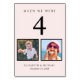 Fun light pink wedding reception table numbers. Each table number corresponds to photos of the bride and groom at that same age (e.g., for Table 4, add photos of the bride and groom when they were 4 years old). If you have a large number of tables, divide them in half and have the first half with one background colour and the second half with a different background colour (e.g., if you have 30 tables, you could have a white table number cards 1 -15, and black table number cards 1-15, and indicate the appropriate table number colour on the place cards.