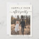Light cream elopement or smaller wedding announcement and reception invitation. The front features your wedding day photo and "Happily Ever After Party" in simple typography and a trendy script with swashes. Add your first names and wedding date. On the reverse side, personalise your wedding announcement and reception invitation in more detail, input your wedding website URL address to create a QR code for guests to scan to see your wedding photos, all the details and to RSVP online, and add your names in a signature-like script.