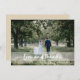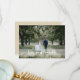 The card shows an example image of a couple on their wedding day, the wife is blond and wearing a lace boho wedding dress and the groom is wearing a sharp rich blue suit. They are walking in a meadow grass framed by rows of mature trees. The scene is wild and romantic. This images is designed as a placeholder to be replaced by your favorite photo or family picture.