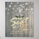 Pick A Seat Not A Side Wedding Sign Poster - Elegant Lettering Script, Vintage Champagne Glasses and String Lights on Rustic Wood Background.