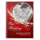 Our Wedding -- Romantic personalised spiral-bound notebook can be used as a planning journal or guest register for small weddings and brides on a budget.  Traditional vintage-style custom photo template with floral frame on royal red background, gold and white accents, gold wedding rings, and beautiful script lettering.  Customise the names of the bride and groom, add the wedding day, or add your custom text and create your own keepsake journal. Click "Customise It" to edit the font styles and colour, or easily change the text fields for alternate bridal accessories such as wedding planners, shower favours, unique gifts for Mother of the Bride, Maid of Honour, Bridesmaids, or as a personal wedding planner for keeping notes and lists organised. Custom personalisation available for matching postage stamps. greeting cards, magnets other gifts upon request. Illustration © Teri Francis. Wedding Organiser Binder also available upon request.