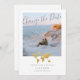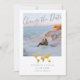 Photo change the date announcement card for a destination or travel theme wedding that's had to be rescheduled or postponed with minimal and modern typography, and a gold world map with editable heart location on the back. Click CUSTOMIZE FURTHER to move the heart or change fonts.
