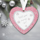What a wonderful and romantic way to propose marriage to your sweetheart! This pretty ornament features a white heart framed in faux diamond gem images on a pretty rose pink and silver floral damask background. Inside the white heart is your text in matching silver grey, plus twinkling snowflake images. The text is fully customisable, so you may make it say whatever you'd like. There is a 2nd text field on the back, which has the same faux diamond border and inside image. This is a special keepsake gift that will be treasured forever. *Please note - the image is printed, and the ornament does not contain metal, glitter, or gems.*