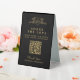 Wedding share your photos upload link table top sign in gold and black portrait format. Personalise with your own wedding upload page via QR code link details, your names and thanks. Ideal for a formal wedding, to get your guests to help share the love and capture your day from all the tables. Other matching items are available. © Original hand drawing and design by Sarah Trett for www.mylittleedenweddings.com on Zazzle.