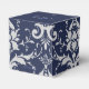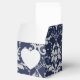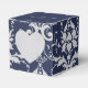 Shown here is the square box style favour box. This box coordinates with the temple wedding invitation and reception invitation. Has the Silver Coronation pattern on all sides of this favour box. A heart shaped cutout on front. Personalised names of the newlyweds across the top flap in coordinating colours to the Sapphire Blue top. Personalised wedding date on top flap. To personalise the names, click the "unfolded" button after clicking customise button. Customise this item to your desires.