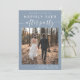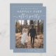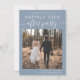 Modern dusty blue save the date announcement for your post-elopement or private wedding reception featuring your photo and "Happily Ever After Party" in a mix of simple white typography and a chic white script with swashes. Under your photo, add your first names and reception/party date and location.