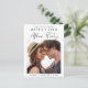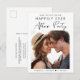 Chic elopement or smaller wedding announcement and reception save the date postcard. The front features your photo and "Save The Date For Our Happily Ever After Party" in a mix of simple typography and modern script. Under your photo, add your first names and wedding reception date. On the reverse you can personalise your announcement and save the date in more detail and add your names in a signature-like script.