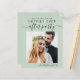 Stylish budget-friendly sage green elopement / private wedding announcement and reception save the date that features your wedding day photo and "Save The Date For Our Happily Ever After Party" in modern typography and a chic script with swashes. Under your photo, add your names and reception date and location; on the back side, personalise your wedding announcement, input your wedding website address to create a QR code for your guests to scan for more information and add your names in a signature-like script.