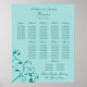 A wedding reception seating chart is an elegant way to direct your guests to their tables instead of using place cards. You can also keep your seating chart as a momento of your wedding and the people who celebrated with you. This wedding seating chart features dark turquoise swirls and curls on a lighter aqua blue or teal background. It is designed to fit in a standard frame and comes in the following sizes: 11x14, 15x19 and 23x29. You can supply your own frame, or order your wedding seating chart with a frame included. We also offer a square version of this wedding seating assignment chart.