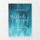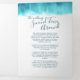 A six-page modern art teal wedding renewal program. Edit this wedding program with your own wedding renewal names, dates, introduction, ceremony wording, wedding party attendants, two photos of your first elopement or restricted wedding, and yours thanks. Original abstract washed watercolor art and design by www.mylittleedenweddings.com