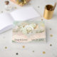 Wedding bands in a seashell with flowers and net in abstract heart frame on pink and green watercolor background.