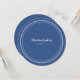 Fully customisable elegant wedding round plate guest place cards feature a minimalist design in classic blue & white. Delight your guests with personalised cards featuring each guests name & table number! The opposite side is solid blue. Customise our simple to use template with your own wedding details! Order each card separately after customisation of guest name with the template.