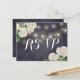 Wedding RSVP Reply Postcard Templates - Elegant White Hydrangea Flowers and String Lights on Vintage Navy Blue Floral Linen Background.