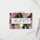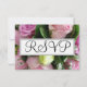 Wedding RSVP written in elegant black script inside geometric white and silver colour rectangle. Soft pink roses in background, Personalise backside in gold colour and black typography against crisp white background. Original Photography and Design by TamiraZDesigns.