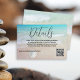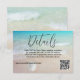 Wedding details card with a beach theme and option to reply online. Modern script "details" (or RSVP) at the top with a paragraph of printed text and place for website url as needed. Include a QR code for guests to easily access a reply location, or you may delete the code image in the design tool - "customise further". Tropical blue water and beach sand is the background with a little white sand dollar.