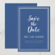 Announce your upcoming event with our modern and simple classic blue and white Save The Date wedding announcement! Invitation suite features a minimalist design with a double frame border in crisp white on a chic blue background. Traditional wording provides timeless yet modern sophistication. Personalise wedding design with your first names and date in white lettering and script. The back of the card matches in solid blue.