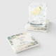 A stylish white background. Decorated with eucalyptus leaves, sprigs, greenery and faux gold sprigs. Faux gold glitter dust. Personalise and add your names and the wedding date. The name is written with a modern hand lettered style script.