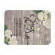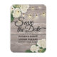 Wedding Save The Date Magnets Templates - Elegant White lovely Watercolor Hydrangea Flowers and String Lights on Rustic Wood Background.