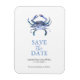 These custom save the date magnets feature a watercolor crab in shades of blue. The words "Save the Date" are typeset in a complimentary. Use the template fields to type your personalised information. A charming choice for beach destination weddings. To see more from this wedding theme visit www.zazzle.com/dotellabelle